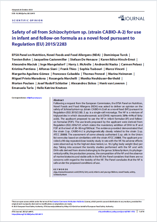 從2021年7月嘉必優(yōu)向歐盟委員會(huì)及歐洲食品安全局(EFSA)提出要求對(duì)裂殖壺菌(CABIO-A-2)藻油作為NF的安全性提供科學(xué)意見(jiàn)至今,EFSA一直致力于這項(xiàng)工作,NDA特別評(píng)估了這款產(chǎn)品的特性、生產(chǎn)工藝、擬議用途和使用水平預(yù)計(jì)、每日攝入量、毒理學(xué)、人體研究和過(guò)敏性的數(shù)據(jù)。根據(jù)歐盟委員會(huì)的要求, EFSA對(duì)嘉必優(yōu)裂殖壺菌藻油DHA的安全性發(fā)表意見(jiàn),專家小組于2023年10月26日通過(guò)了該意見(jiàn),歐洲食品安全局對(duì)CABIO-A-2的安全評(píng)價(jià)意見(jiàn)及菌株CABIO-A-2)作為一種新型食品用于嬰幼兒和后續(xù)配方奶粉(根據(jù)歐盟法規(guī))全文已經(jīng)刊登在歐洲食品安全局期刊上。[2]